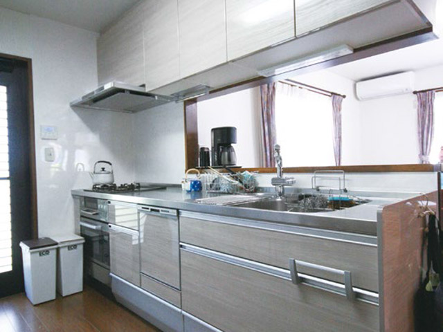 システムキッチンは従来より15cm幅を広げて作業性を向上。 収納部が豊富で食器洗い乾燥機や電動収納庫などを取り付けました。