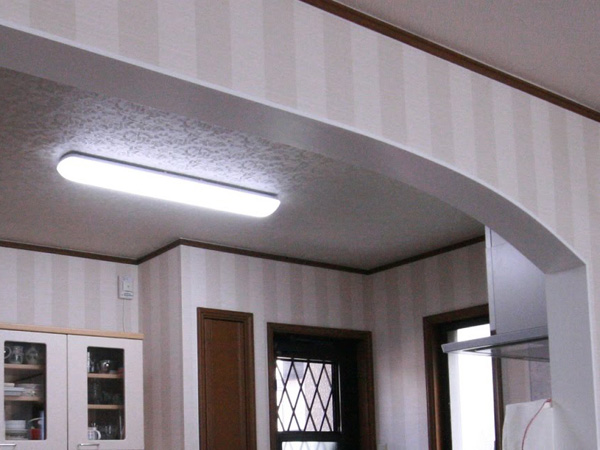 キッチンとリビングの間の仕切りの開口部をリフォームで広くしました。 光がたくさん入るようになり、料理中も気分が明るくなると好評です。 -