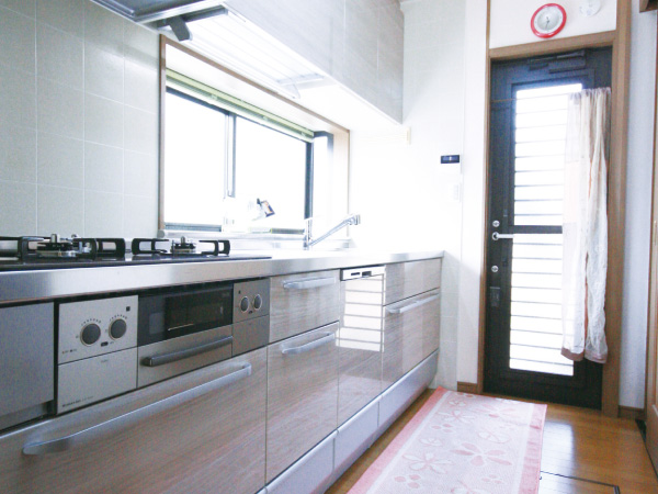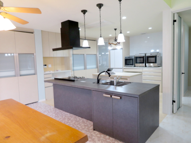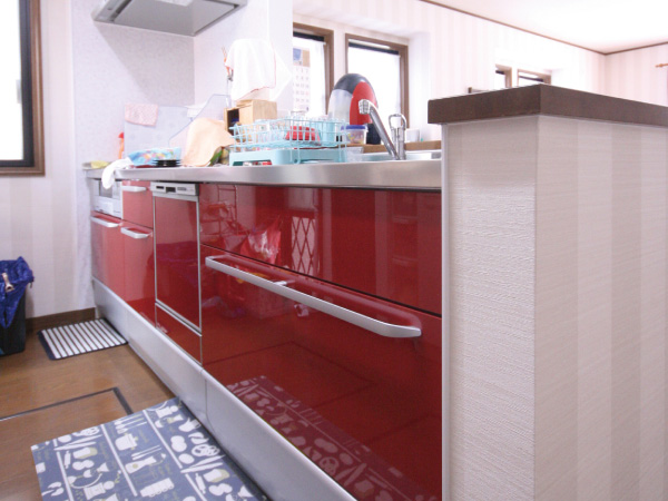 以前と同じ対面式のスペースに収納性と機能性に優れたシステムキッチンを設置しました。 お手入れしやすいレンジフードも便利に使っています。 -