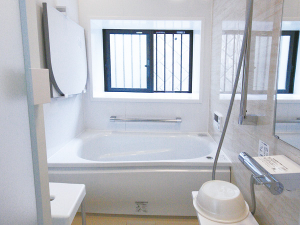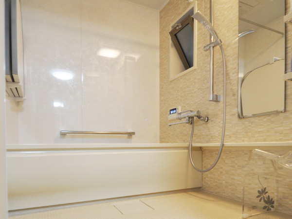 浴室にはトップライト出窓を取付け、明るく開放的な空間で入浴できるようにしました。 また、気泡が出るブローバスを採用し、浴室用テレビも設置しました。 -
