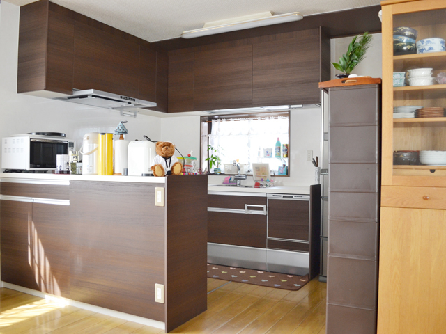 以前と同じ対面式のスペースに収納性と機能性に優れたシステムキッチンを設置しました。 お手入れしやすいレンジフードも便利に使っています。 -
