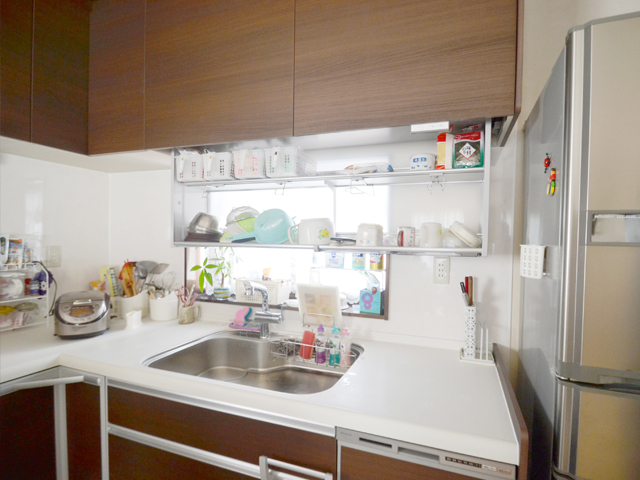 システムキッチンは従来より15cm幅を広げて作業性を向上。 収納部が豊富で食器洗い乾燥機や電動収納庫などを取り付けました。