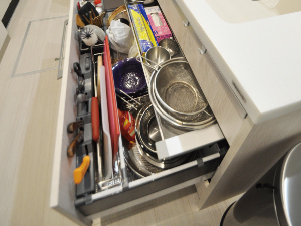 スライドタイプの収納は、探し物がすぐに見つかり奥の物も、かがむことなくサッと取り出せます。 -