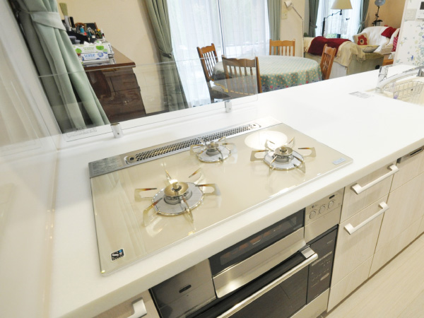 コンロの五徳がすぐに外せて、サッと拭いて お掃除できるようになりました。レンジフードはスイッチを 入れておくと、自動的に運転するので便利ですね。 -